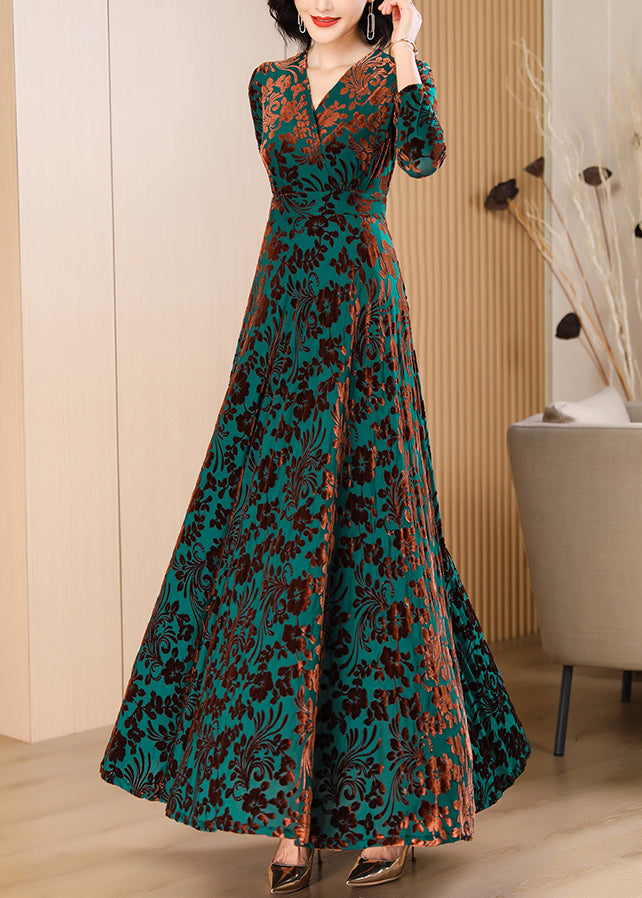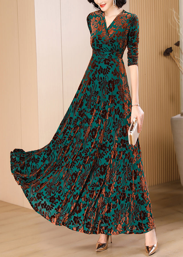 Classy Blackish Green V Neck Print Slim Velour Maxi Dresses Spring