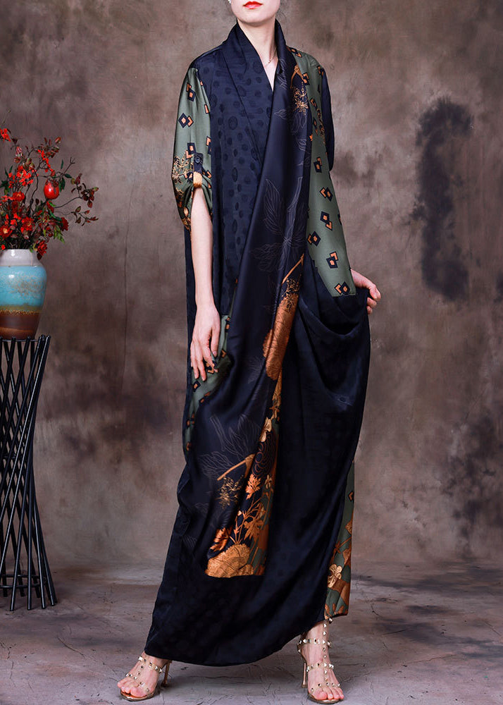 Vogue Green V Neck Patchwork Print Silk Dresses Long Sleeve