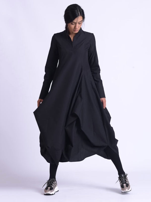 Original Loose Solid Color Pleated Stand Collar Long Sleeves Midi Dress