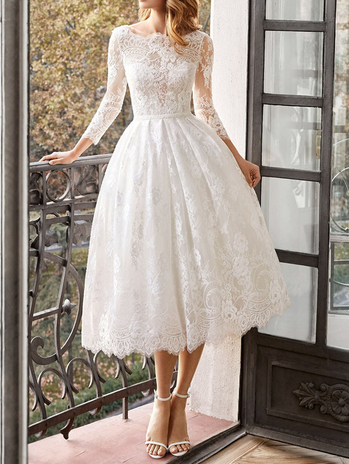 White Elegant Plain 3/4 Sleeve Backless Lace Wedding Puffy Dress