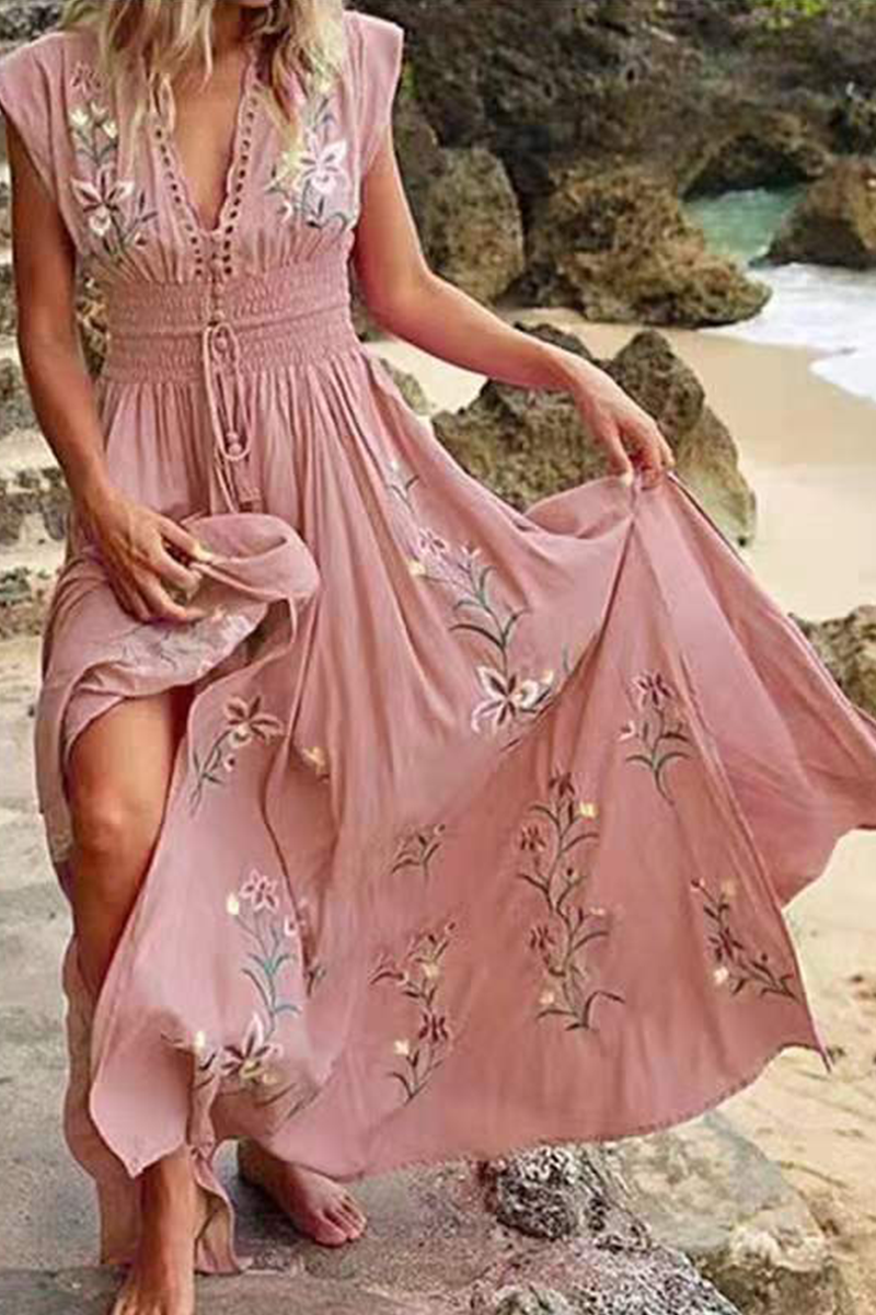 Classy Pink Print Wrinkled Tie Waist Chiffon Maxi Dresses Half Sleeve