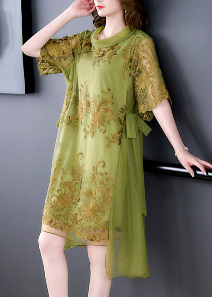 Boutique Green O-Neck Asymmetrical Embroideried Floral Tie Waist Tulle Maxi Dress Summer
