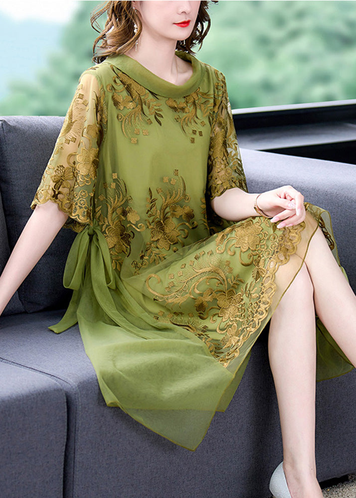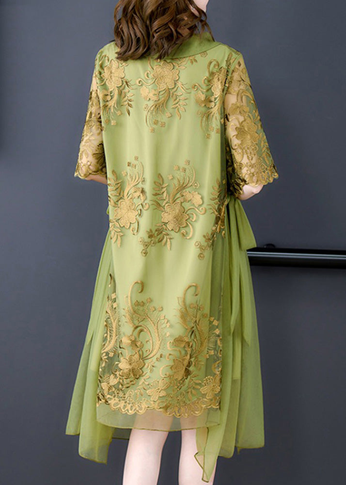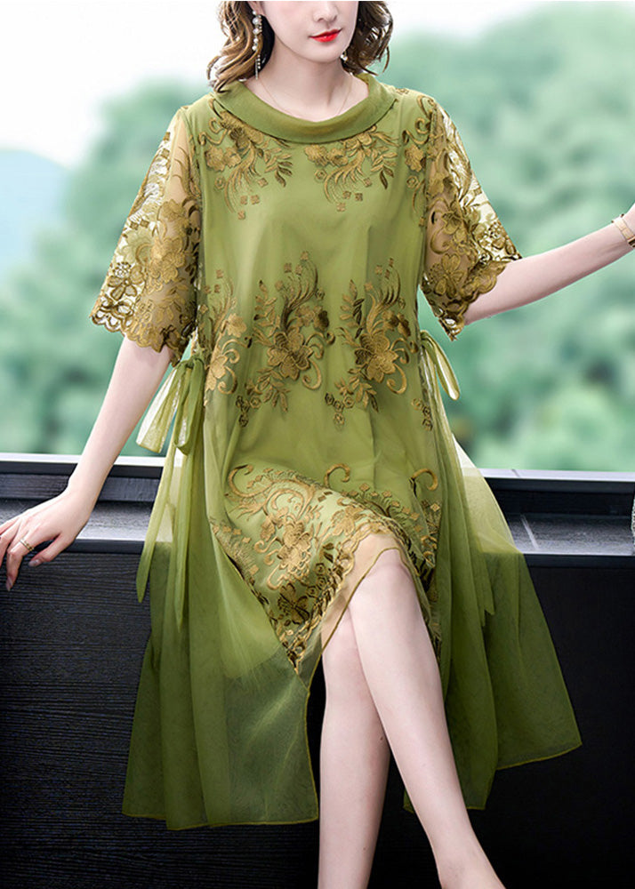 Boutique Green O-Neck Asymmetrical Embroideried Floral Tie Waist Tulle Maxi Dress Summer