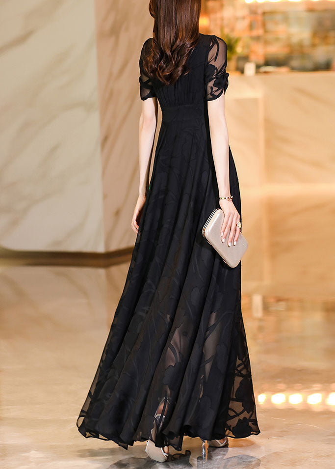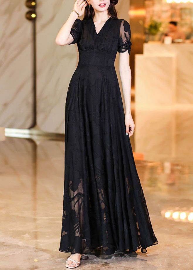 Fashion Black V Neck High Waist Tulle Patchwork Chiffon Long Dress Summer