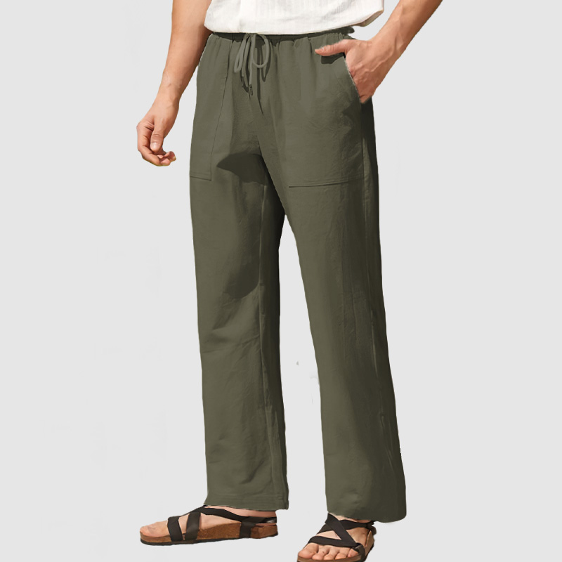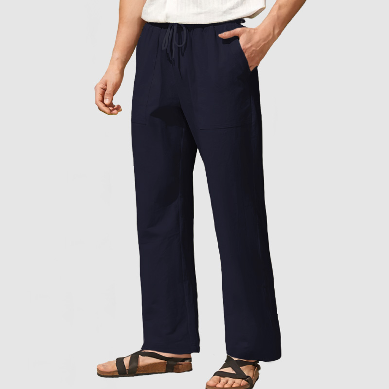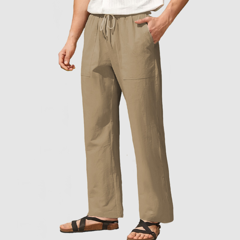 Wear the drawcord inside or outside to reduce bulk. The men's open-bottom linen-cotton pants with drawstrings for adjustability.