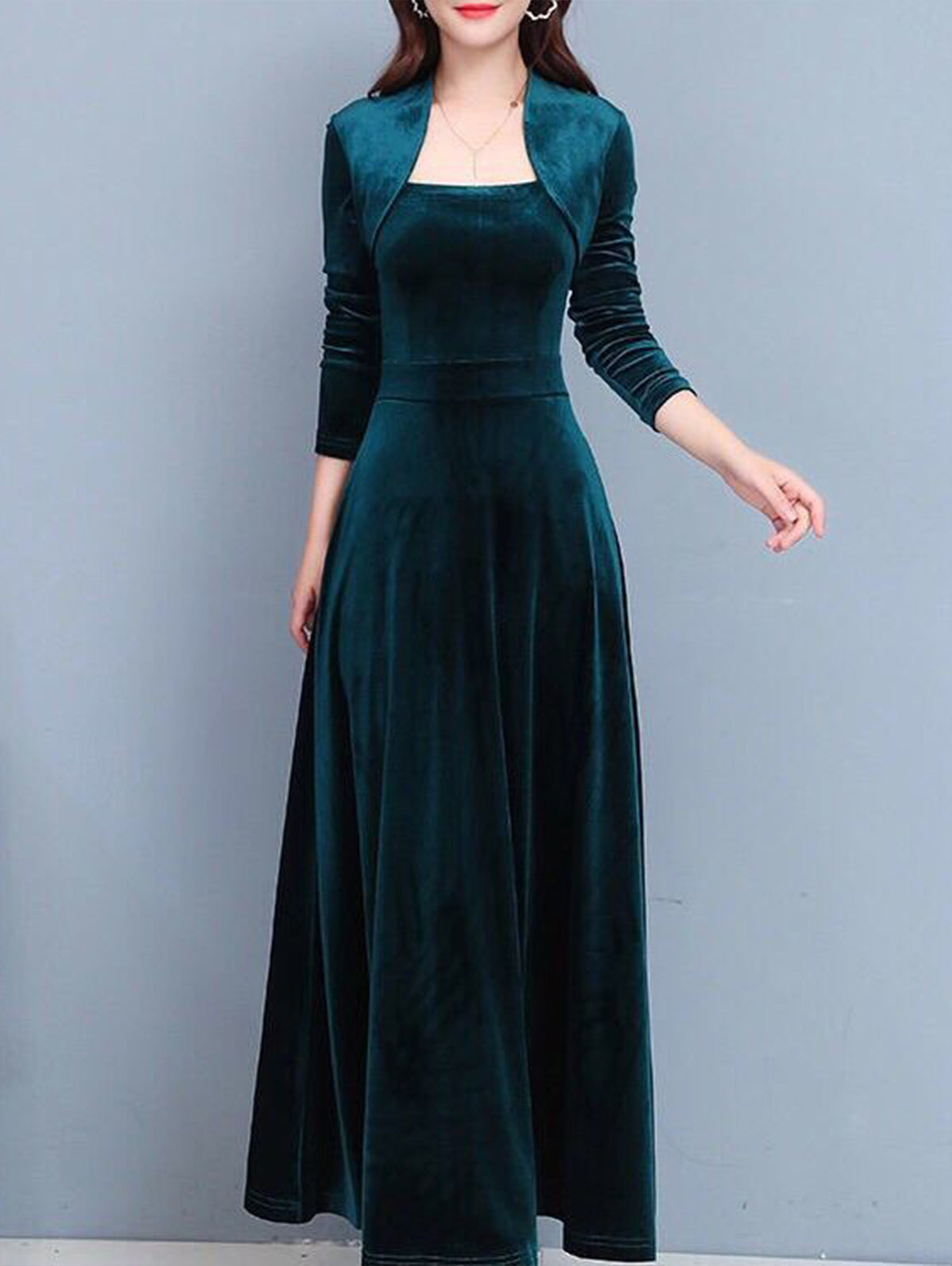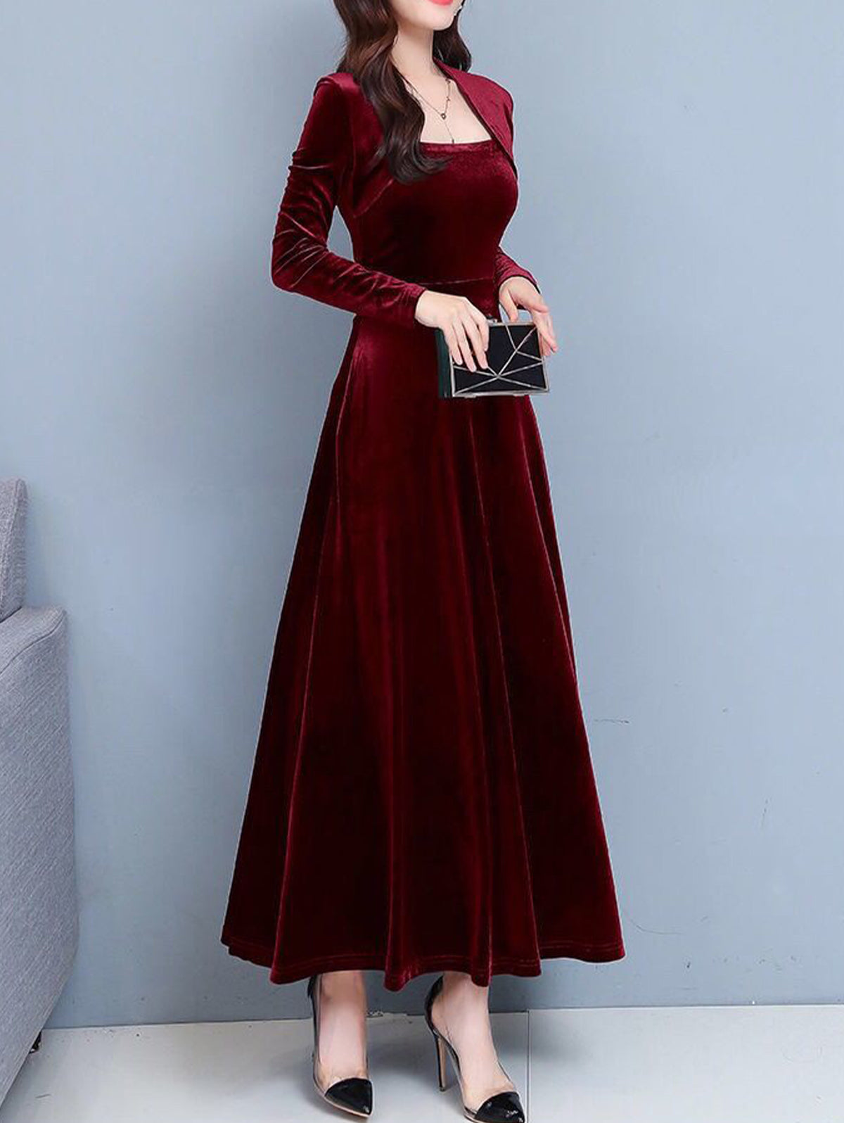 Black Retro Three-quarter Sleeve Golden Velvet Maxi Dress