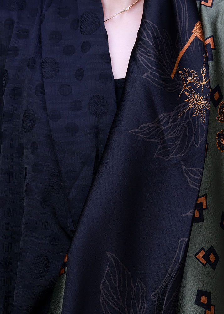 Vogue Green V Neck Patchwork Print Silk Dresses Long Sleeve